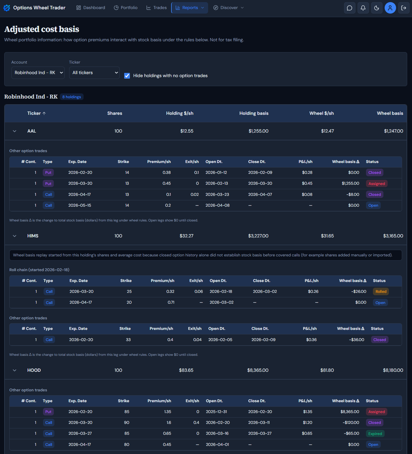 - Wheel basis is a modeled per-share and total basis after applying closed option legs in chronological order using the wheel rules implemented in the product (see below). You can sort holdings by ticker, shares, holding basis, or wheel basis, and use filters (account, ticker, and “hide holdings with no option trades”) to focus the list.