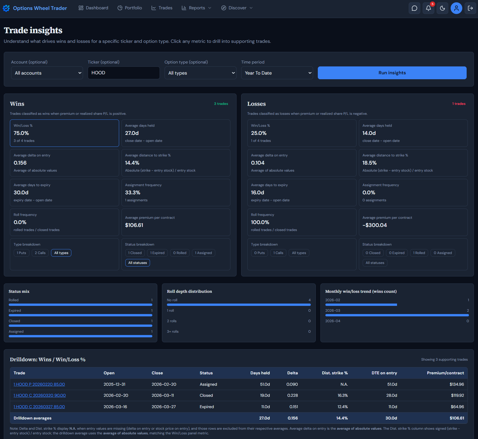 The Trade Insights report in OptionsWheelTrader is built for that. It gives you a side-by-side view of wins and losses, then lets you click into each metric and inspect the exact trades behind it.